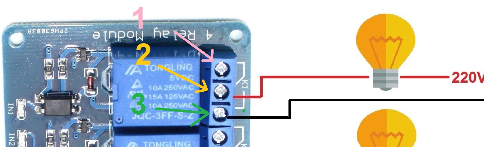การต่อหลอดไฟ 220v ให้ต่อตามรูปข้างล่างนี้ จะเห็นว่า ก่อนที่สั่งงาน Relay หน้าคอนแทค 2 กับ 3 ยังไม่ติดกัน ทำให้ไม่ครบวงจรไฟเลยไม่ติด แต่ถ้าส่งสัญญาณมาสั่งงาน Relay หน้าคอนแทค 2 ที่ติดอยู่กับ หน้าคอนแทค 1 จะโยกมาติดกับ หน้าคอนแทค 3 ไฟไหลครบวงจรไฟจะติด